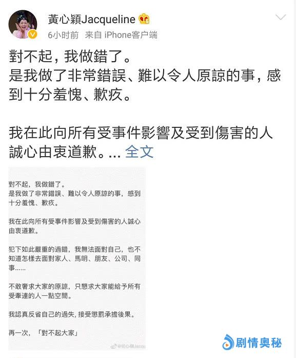 不过,许志安已经为自己犯下的错,做出了非常诚恳的道歉和忏悔。而黄心颖也多次向公众及受此事牵连的所有人表达了歉意。她最早是透过TVB的高层发出了致歉的声音,后来又在社交平台包括微博上发出一篇致歉信,在信中强调自己会认真反省自己的过失,接受惩罚,并且承担后果。