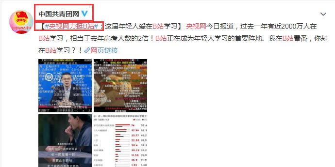 前几天“蔡徐坤给B站发律师函”的话题上了热点,蔡徐坤工作室怒斥某站造谣和抹黑,要求删除视频并道歉。引起了网友的热议,翻看评论,支持某站的占多数。今天央视网公开夸赞力挺B站,中国共青团网大力转发,称过去一年有近2000万人在某站学习,相当于去年高考人数的2倍!某站正在成为年轻人学习的首要阵地。要知道央视网从不轻易夸人!网友们纷纷在评论区对某站表示感谢,有的在上面学会了PR和PS,有的在上面学习心理学和计算机,有的在上面学习拉手风琴和看歌剧,这次你站谁?