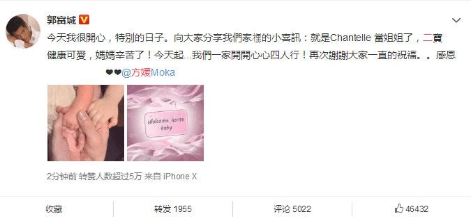 今日郭富城突然发文官宣了方媛诞下二胎的消息而火上了热搜,香港娱乐圈的大咖们都纷纷发文祝福郭富城喜提“二胎”,不少网友也第一时间祝贺郭富城再次当爸。而郭富城发了一张“四只手”的图片寓意着“一家四人行”,同时郭富城也十分感谢网友们和亲朋好友的祝福。