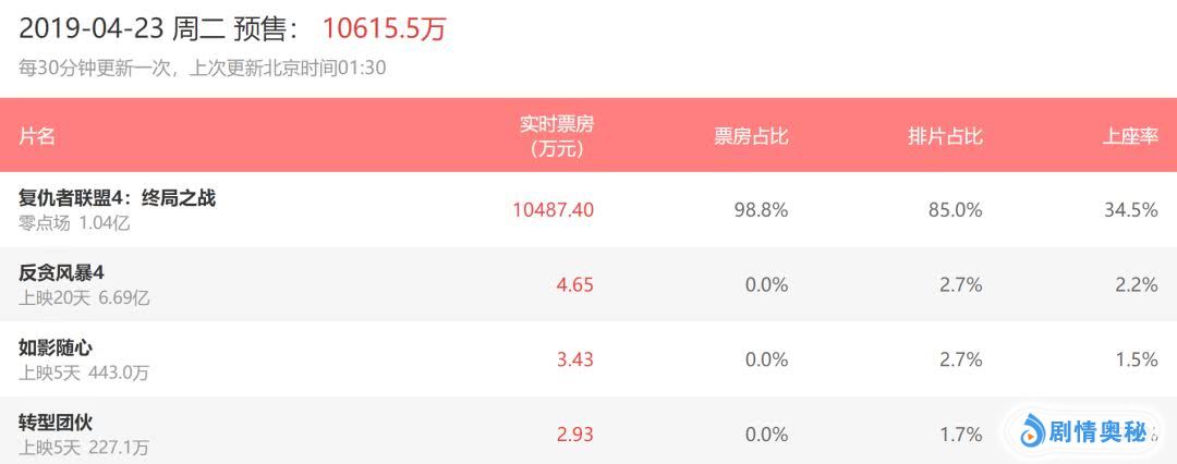 距离《复仇者联盟4:终局之战》正式上映还有4天多点的时间,而该片的预售票房早已经突破3亿,更惊人的是,该片的零点场预售票房已经破亿!这是什么概念?要知道一年下来上映的电影会有超过五百部,这其中的大多数电影的总票房要破亿都难,而《复仇者联盟4》只靠零点场就已经做到!而该片也是中国内地影史第一部零点场票房破亿的电影。