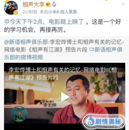 日前,由李宏烨,郑钰,辛杰,姬攀,周培岩,衡小珍和王知亮等人联袂主演的相声喜剧大电影《相声有江湖》揭开神秘面纱,将会在今天下午两点与观众见面,而最近,作为主演之一的公式相声创始人李宏烨博士也转发了这部电影的预告,并且配文称:我也是学习学习,演技还有待提高。虽然,李宏烨博士说得非常谦虚,不过,对于自己的这部作品似乎是信心满满,非常的开心。