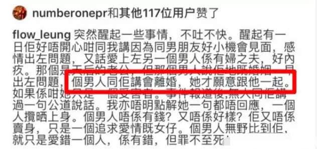 梁裕恒在文中表示,之前黄心颖曾经和他提起过,说她爱上了一个有妇之夫,而且还是天后的男人,心里觉得好内疚。但对方和黄心颖说自己的婚姻出了点问题,并答应黄心颖会和郑秀文离婚,黄心颖才答应了跟他在一起。