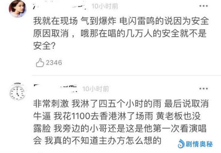 之后主办方也是各种的推辞,隔一段时间就说推迟,结果大家在雨中淋了5小时,却说要取消演唱会,大家可以返回了。而取消的原因,也是说雨天不安全。真的很好奇,粉丝和观众都等了5小时,淋了5小时就安全了吗?艺人还没出场,就说不安全取消,这就有点太让人反感了吧?