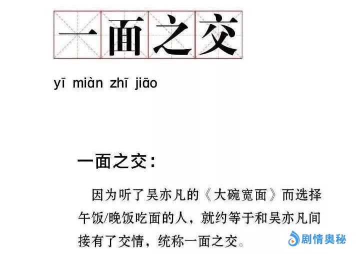 在2017年的综艺节目《七十二层奇楼》中,吴亦凡在面馆做任务,被客人要求来一段即兴说唱。于是,“你看这个面它又长又宽,就像这个碗它又大又圆”便横空出世,这句歌词成为网友的玩梗对象。
