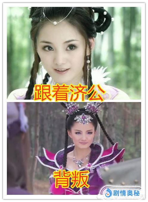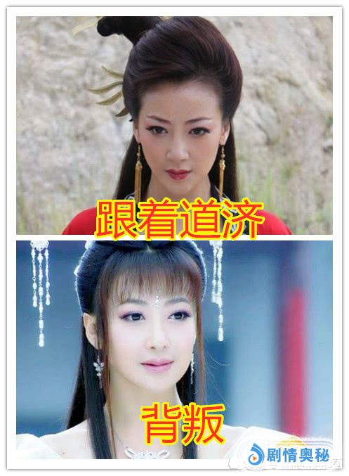 本来一心想找道济报仇时,是一身红衣装扮,而且呢,眉头紧锁。怎么都像是一个怨妇。但是成仙后,一切都释然了,连带着这个眼神也变得温柔了。而且呢,仙气飘飘的。