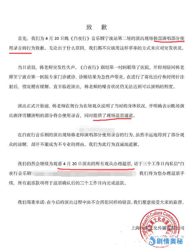 从官方的之前声明中可以看到,韩雪是因为”急性声带炎“导致无法演唱,所以相关方面才会使用录音,他们承认这样处理有点草率,并承诺将会为4月20日的观众进行退票。