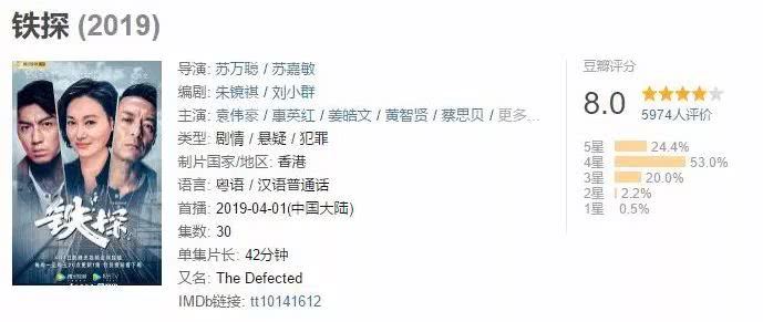 剧中角色多且立体,剧情也颇为在线,节奏也不拖,制作上有大场面,但有不会一味沉迷于大场面,所以观众对于《铁探》的评价颇高,剧情过去三分之二,但豆瓣评分依旧稳定在8.0,可见整部剧还是蛮稳的。至少不会像《再创世纪》那样完美开局结果越走越低,感觉这一次TVB的合拍剧终于不坑了!