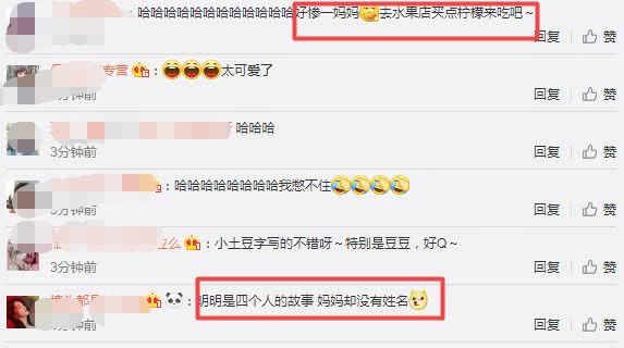 对此,网友也纷纷留言:“好惨一妈妈,去水果店买点柠檬吃吧”、“明明是四个人的故事,妈妈却没有姓名。”“和亲爹一起霸占劳动果实 你只能和小茉莉一队了。”