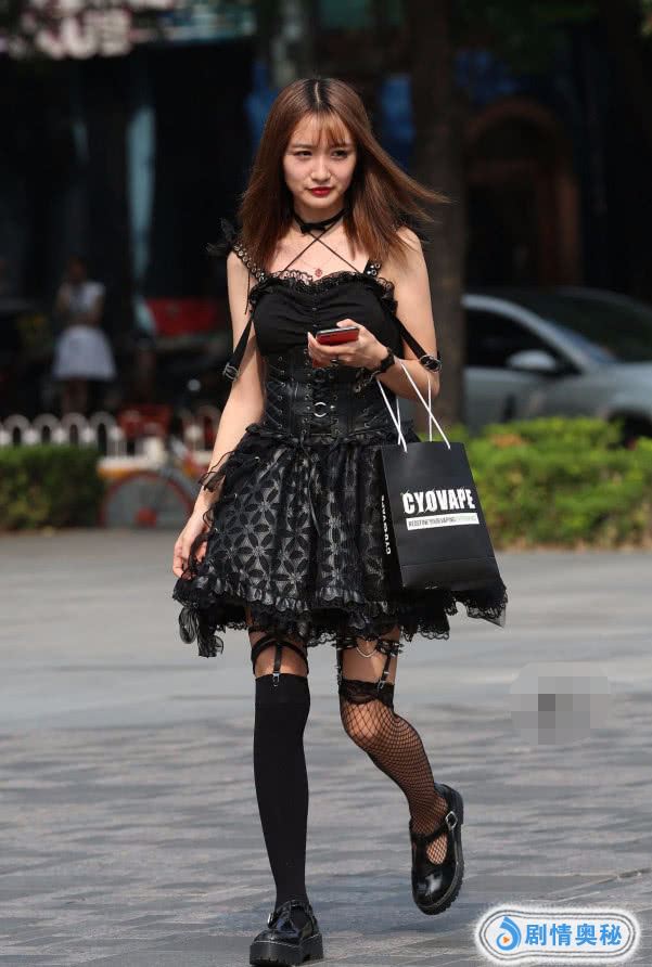 lo娘逛街买什么不是重点,她手里拿着一个购物袋,不知道买的是什么东西,她的打扮已经完全抢镜了,她的裙子上面有一些黑色纱网装饰,看上去很特别,这裙子层叠的设计,这样像个黑魔仙。