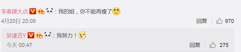 不仅仅是网友觉得现在的吴谨言瘦成了皮包骨,连她的好朋友也被吴谨言吓到了,之前跟吴谨言一起合作出演了《延禧攻略》中的舒妃的李春媛,两人也结下了深厚的友谊,吴谨言的很多的动态,李春媛也都有到她的评论区评论,看得出来两人的关系非常的要好,也正是因为是好朋友,所以看到吴谨言瘦成了这样,李春媛才会吓一跳。