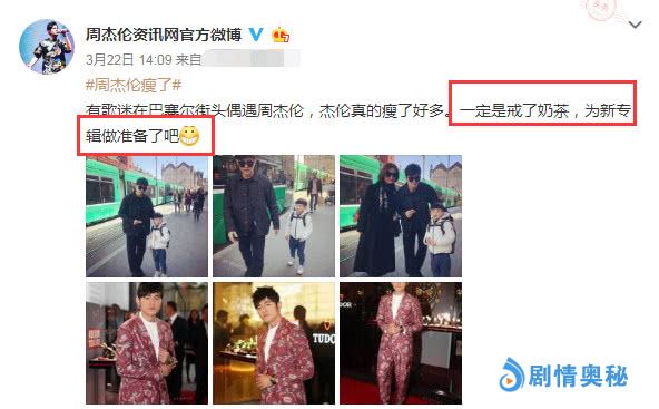 别被“周杰伦怕太瘦了,歌迷认不出”欺骗了!周杰伦为了新专辑,到处采风,确定主题。还为了配合新专辑成功瘦身,为此短时间会戒掉奶茶(周董最爱饮品)。目测最少瘦了二十斤。有歌迷、有官方社交平台、有近照为证。新专辑会在年底之前出来,作词人方文山在其个人社交平台疑似透露了小段歌词,还有周董年底演唱会拟邀嘉宾是阿信!