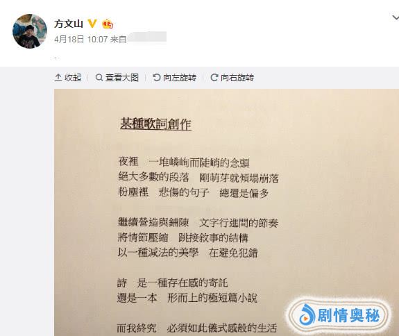 周杰伦的好友,著名作词人方文山,最近在其个人社交平台也是时不时就透出点口风,像是类似歌词的文字,还有周杰伦在录音室搞创作的照片等。看到他们紧锣密鼓搞创作,作为歌粉的小编表示“非常期待了!”