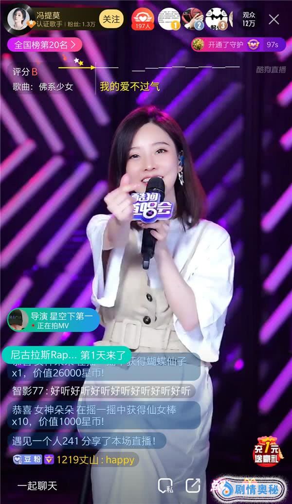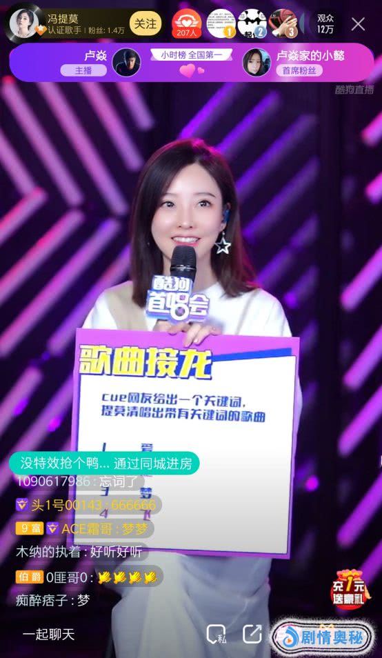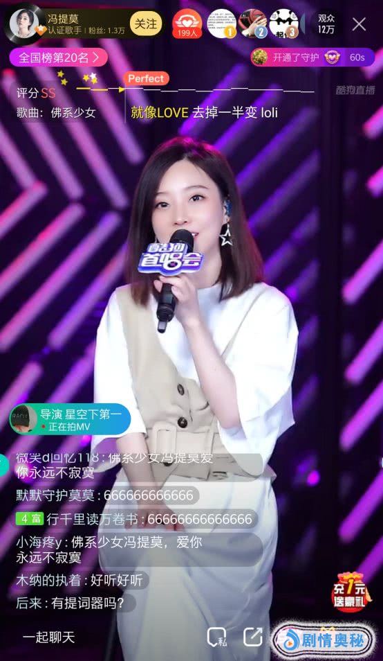 一首《佛系少女》在酷狗斩获超76万热评歌,拿下酷狗TOP500连续霸榜406天傲人成绩,更让冯提莫的名字传遍全网。4月17号晚,冯提莫首次做客酷狗,举办个人新单曲《看到风》首唱会。当晚冯提莫丝毫不吝惜歌喉,金曲连连,还和观众欢乐互动,吸引超150万人前来围观,直播间简直被围得是水泄不通,礼物刷个不停!