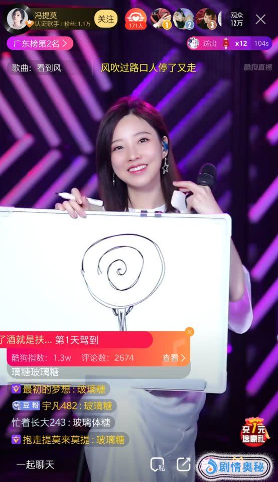 自认“灵魂画手”的冯提莫更和大家玩起了画图猜歌名的游戏,她开玩笑说:“抽象派,能认出来的肯定是真爱”。冯提莫简单勾勒几笔,一根棒棒糖出现在画板上,这时就有不少观众在公屏敲出《玻璃糖》,直播间真爱粉不少哦。