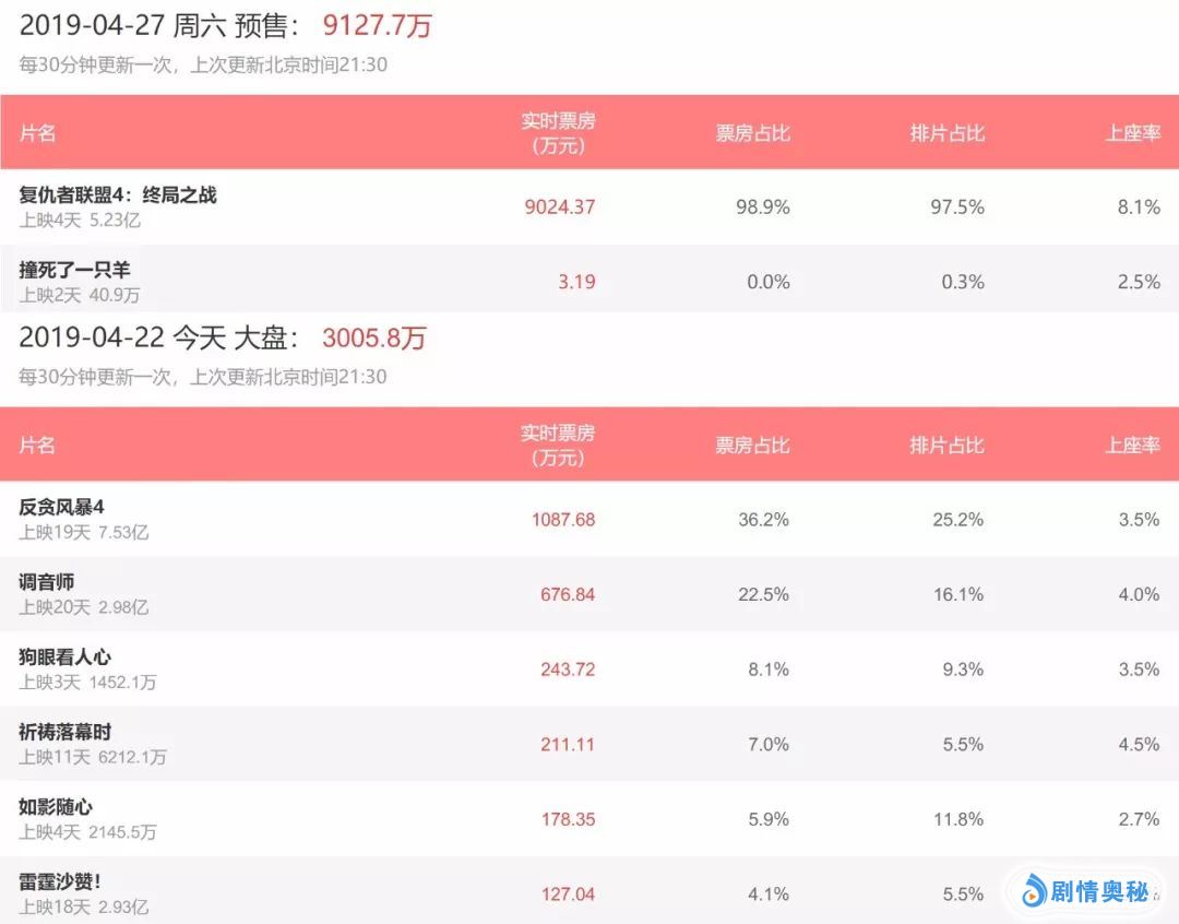 (数据来源猫眼专业版,截止至2019年4月22日21:30)