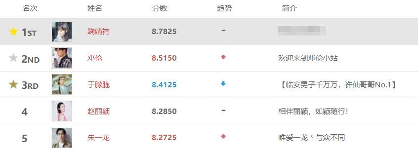 再说冲至第二名的邓伦,4月下旬邓伦热度飙升,有热播的新版《封神演义》,有频频更新宣传视频的新剧《我的真朋友》(邓伦杨颖领衔主演),还有让邓伦与杨幂频频空降热搜,成为网友关注焦点的网综《密室大逃脱》,邓伦冲至第二名也在情理之中。接下来邓伦与杨颖领衔主演、朱一龙出演男二号的新剧《我的真朋友》定档在即,相信邓伦有超越鞠婧祎,登顶演员榜的可能。