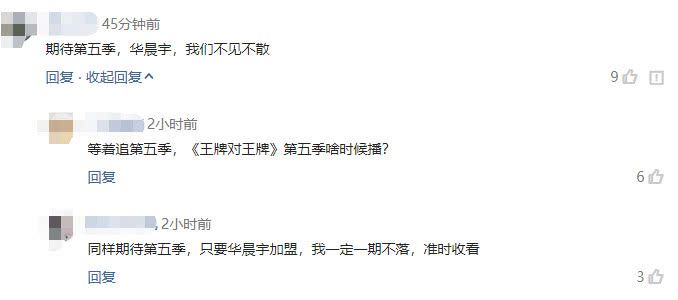 也正是因为《王牌对王牌》第四季太过成功,尚未开拍的第五季未播先火,可以看到有许多网友已经开始期待尚未开拍的第五季《王牌对王牌》,不少网友表示只要华晨宇留下来,他们会一期不落,准时收看。江湖路远,我们不说再见,最后祝华晨宇航天晚会演出顺利,也期待与你在第五季《王牌对王牌》重逢!