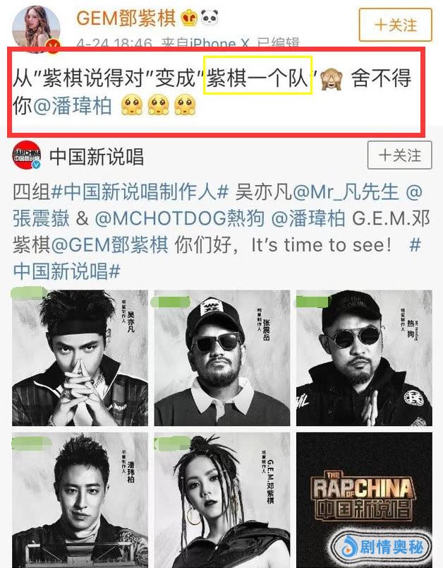 4月24日,新一季《中国新说唱》公布制作人阵容,第一季中的四组制作人,吴亦凡、张震岳、热狗、潘玮柏、邓紫棋将悉数回归,这场嘻哈界的盛宴将再度燃爆今夏。但本季与上一界略有不同,原来的潘玮柏和邓紫棋是一组的队友,现在把邓紫棋单分出来,另组一队,和其它三队进行PK。