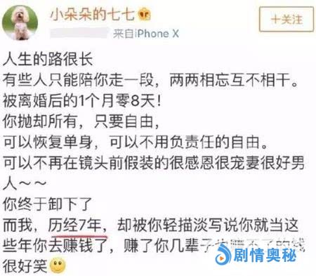 对于离婚这件事,前妻七七曾发文称:最傻的女人就是什么都不图,只图他对你好,到最后那些拜金女过得都比你好,你可以图一个男人的钱或者其他,但是,千万别图他对你好,如果,一旦有一天他突然不对你好了,那么你就什么都没有了。看得出来,七七对前夫骚男还是有很多怨言的,不知道两人为何会弄成今天这个地步,还是让人非常意外的。