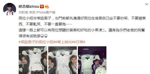 要知道从之前修杰楷晒出的开车载两个女儿出门的动态来看,每次出门前为避免坐在后座上的咘咘、波妞吵架、抢东西或是哭闹,他都要和咘咘、波妞沟通好,而且,为了确保两个女儿乖巧地坐在安全椅上,他还会为她们准备想听的音乐和好吃的小零食。