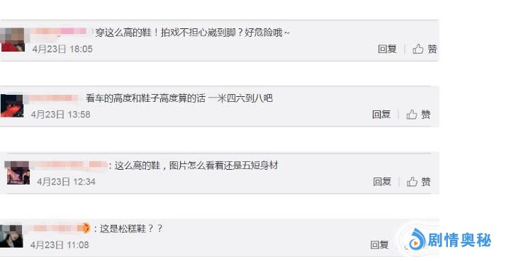 不少的网友看到之后纷纷直言:“穿这么高的鞋子不怕崴脚么”、“看鞋子的高度,应该是146到148”、“这么高的鞋子,身材五短”......等等,大家的注意力都被鞋子给吸引了。