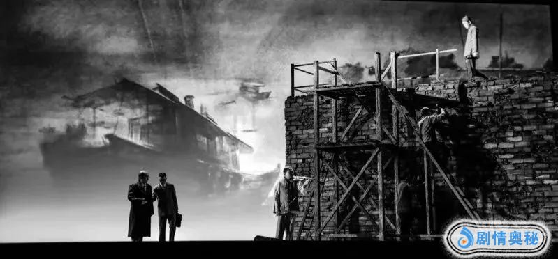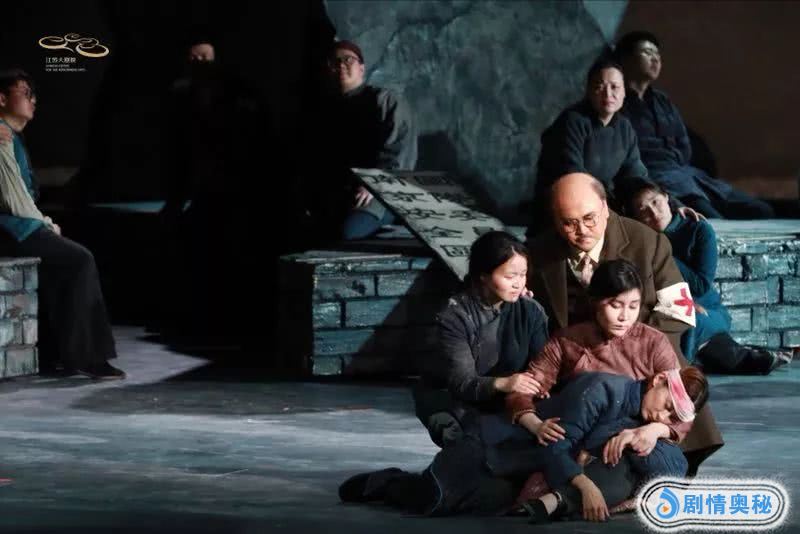 “在狂轰滥炸的日子,只有音乐能给我些许慰藉。”伴随着一曲巴赫小提琴曲,观众的记忆被带回了1937年的南京中山码头。舞台上破败的石墙无助地矗立在江边,看着往来的人群,弥漫着一股衰败的氛围。自从淞沪会战中国军队失利之后,步步紧逼的日军已经兵临南京城下,在一片狂轰滥炸中,南京到处是断壁残垣,恐慌的心情充斥城中,而逃难的人群滚滚而去,把这份慌乱扩散开来。