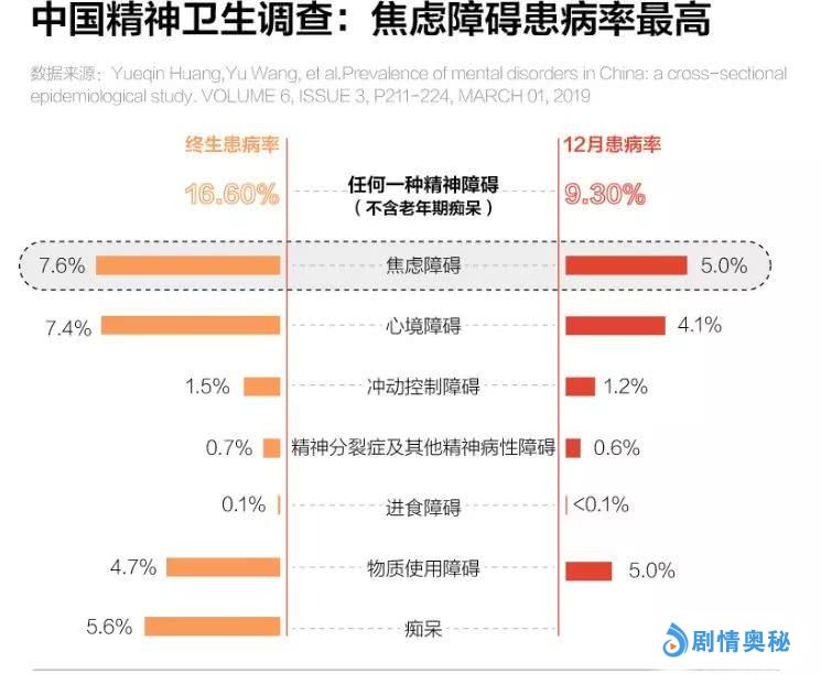 从全球范围看,焦虑症的普遍程度,已经超过了人们熟知的抑郁症,成为人类精神健康的头号敌人,尤其在中国。早在2017年,就有官方数据称,全国焦虑障碍患病率总体上呈上升趋势,为4.98%。权威医学期刊上的调查也显示,焦虑障碍患病率在调查的七大类精神障碍中最高,成人终生患病率达7.57%。