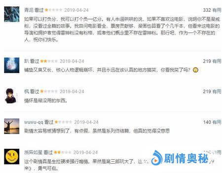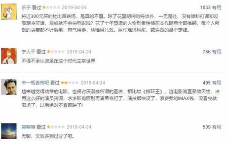其中,很多网友提到最多的就是,电影文戏太多,没有《复联3》那么燃,两个多小时都在铺垫,另外一点就是票价问题,有网友这样评论:300多元的票价不值,除了花里胡哨的特效外,一无是处,没有插科打诨和反高潮冷笑话,漫威就不会拍电影啦?花了十年塑造的人物形象性格在本作随意全部推翻,每个人所做的决策都不计后果,意气用事,幼稚且儿戏。巨作难逃烂尾,或许真的是个定律。还有网友认为就是:故事线混乱,Bug太多,没有当初那种惊艳,留下的仅有情怀。