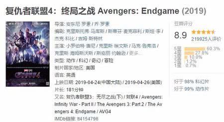 日前,《复仇者联盟4》在内地已经上映3天,总票房已经轻松来到15亿,堪称漫威史上最卖座的电影之一,而今天,该片也是全球首映第一天,能够创造怎样的票房奇迹,我们还是拭目以待吧。关于这部铺垫了11年的作品,很多漫威粉还是非常满意和欣喜的,不过,随着影片的热映,豆瓣评分却发生了不小的变化,从刚开始的9.3分现在已经到了8.9分,尽管很多网友认为这是漫威史上最好的作品,可是依旧有5%的观众给出了一星差评,下面就来看看这些网友都说了些什么吧。