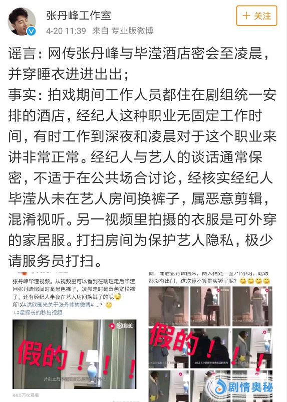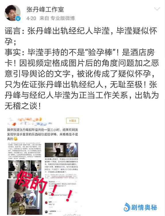 4月20日,张丹峰工作室在微博上不仅发出了一份律师声明,称已经对网上各种传言进行取证并准备上诉,同时还连发多条微博否认出轨传闻,并澄清了网传的所有说法。包括毕滢多次进出张丹峰房间、毕滢联合张丹峰转移财产以及毕滢手拿验孕棒等,工作室一一予以否认。