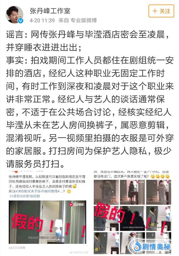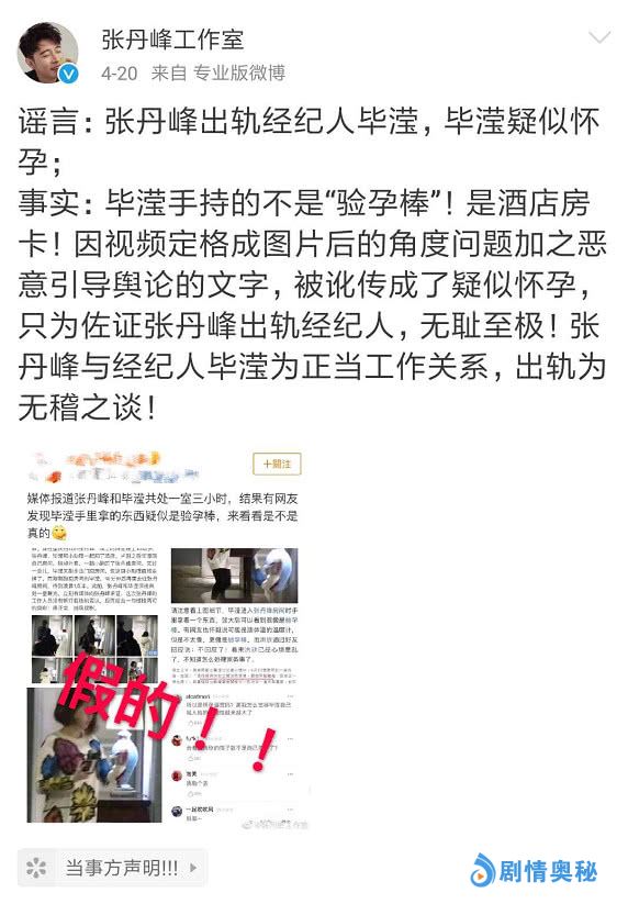 张丹峰和毕滢的传闻最早是在4月8日曝出的,后来各种传言和爆料全都被抖出,而毕滢和张丹峰始终保持沉默。本以为张丹峰会就此凉凉,毕滢也再无翻身机会,结果在4月20日当天,毕滢和张丹峰来了个惊天大反转,将所有负面传闻一概否认。对于毕滢为何反复进出张丹峰房间,张丹峰工作室给出的回应竟是艺人和经纪人沟通不适合在公开场所,而应该选在私密场所。