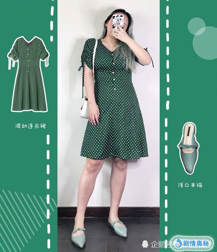 绿色波点连衣裙。波点元素一直都是非常流行的,任何时候都不会过时。墨绿色的波点真的是很美了,中间腰部设计有加宽,显得腰更细。A字裙不挑身材,而且很遮肉。
