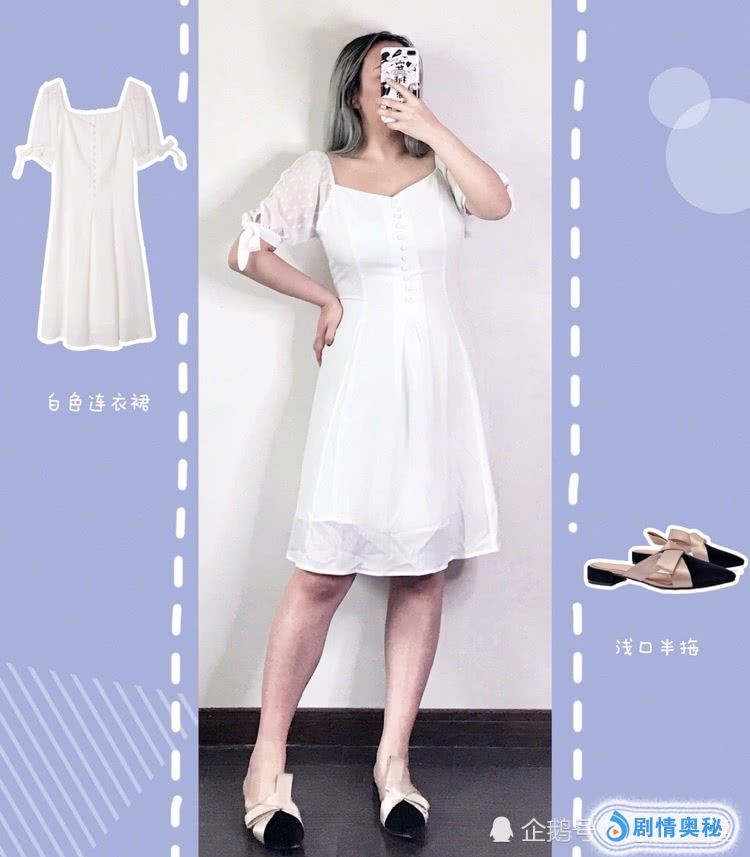 白色连衣裙。裙子长度在膝盖的部位,刚好遮住大腿的肉肉。袖子部分是网纱,非常的俏皮可爱。视觉上也会更显瘦。白色一直都是仙女色,谁穿谁好看。非常的好驾驭。