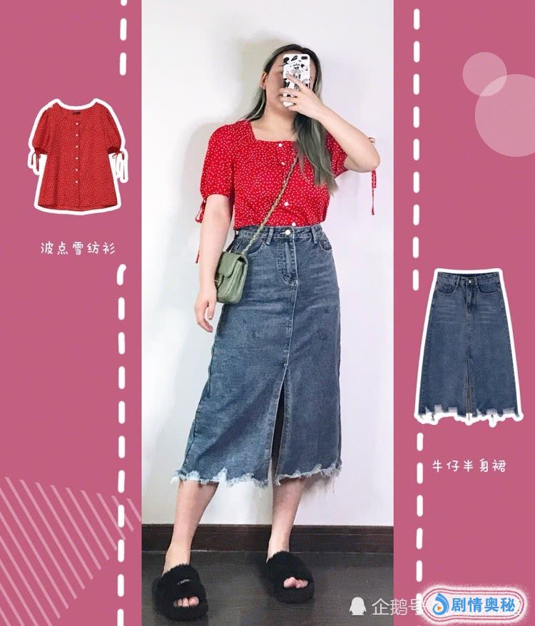 波点上衣+半身裙。波点就是很流行的元素,任何版型都会很好看。半身裙很长,把上衣扎进裙子里,整体很显高,对于微胖女孩视觉上也会有瘦的效果,这一套搭配真的很好驾驭,非常的OK。