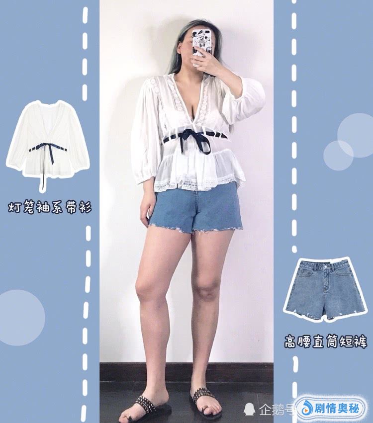 系带上衣+直筒短裤。这件上衣V领真的是很V很深,保守的女孩子里面穿一件背心内搭,关键这件小胸的女孩是穿不出效果的,没有大胸女孩好看,灯笼袖真的很具有包容性了。