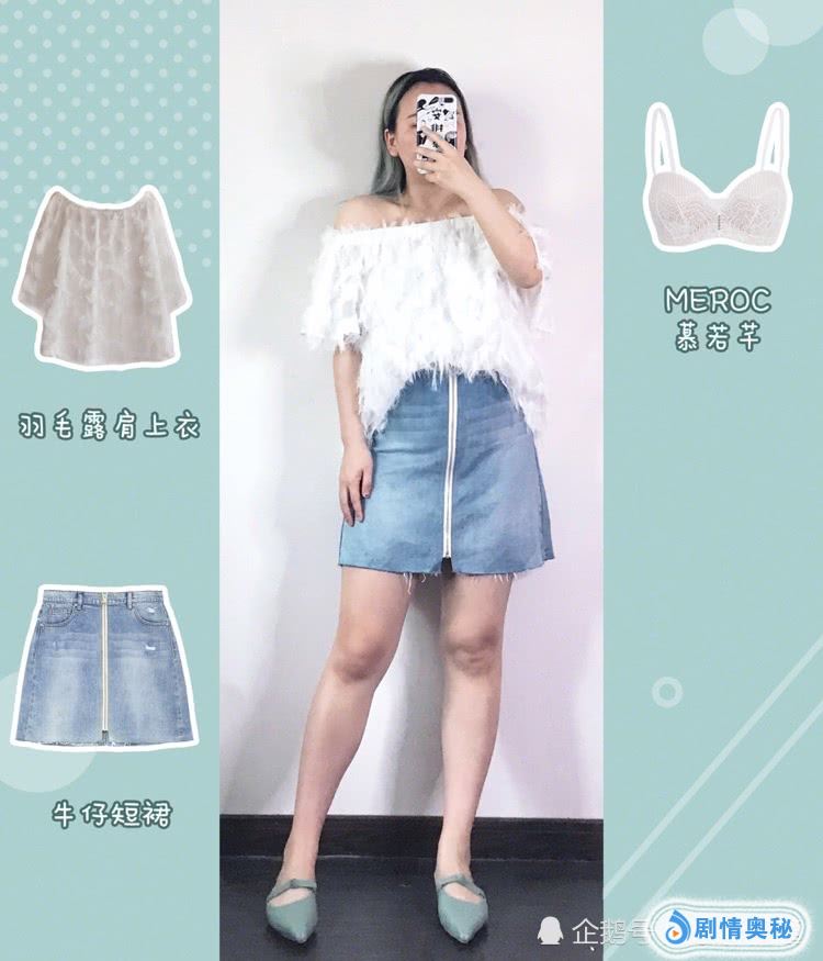 羽毛露肩上衣+牛仔裙。这件羽毛上衣真的是小仙女代表了,穿上立马感觉到仙气十足,可以白到发光。搭配一件牛仔短裙,非常简单的搭配但又很时尚的感觉。