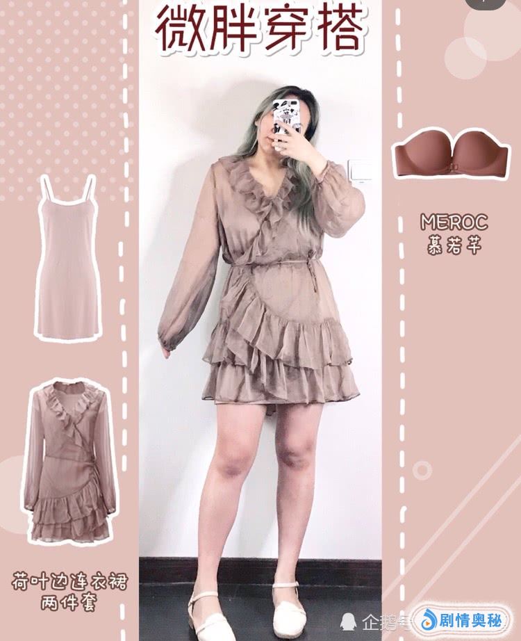 荷叶边连衣裙。非常美的一条仙女裙,重点是两件套,胸前荷叶边翻领显瘦又减龄,同色系的内搭,完全不会透。袖子空松很遮肉,V领的设计很显脸小。颜色很洋气。