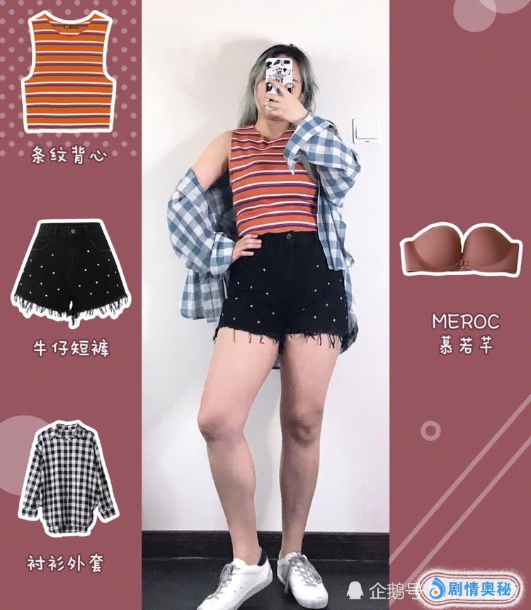 条纹背心+牛仔短裤+衬衫外套。这一套的搭配是非常基础的,很常见的穿衣方式,衬衫外套不仅可以遮住胳膊上的肉,也可以当做防晒衣遮阳,非常的实用。