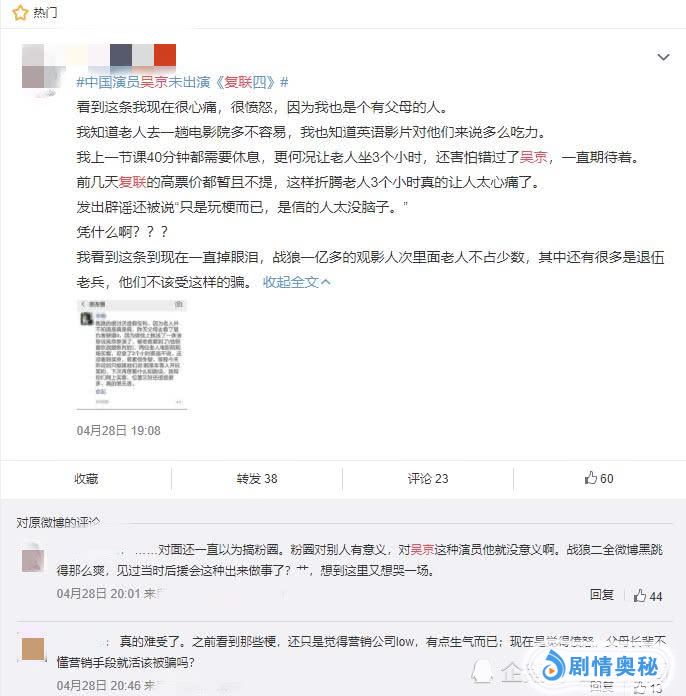 要知道《战狼2》之所以能有这么惊人的票房,不仅仅是因为年轻人的支持,更有不少中老年人、退伍老兵等等支持。他们虽然不上网不追星,但却是吴京的忠实粉丝,认可他的电影质量和风格。然而正是因为这次的恶意玩梗,让很多老人被骗进了电影院,花高额的电影票枯坐三小时,忍受听不懂的外语,却没有看到吴京。