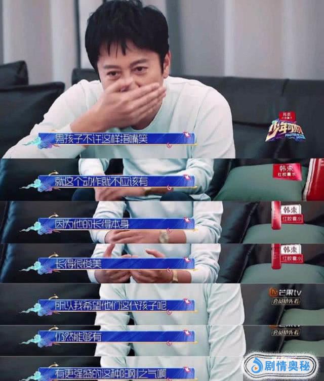 就像在节目上他看到了朱正延的举动,尤其是这个捂嘴的样子。就是说这个不对,说男孩子不要这样捂嘴笑,也更是直言说这样不够阳刚。其实蔡老师说的已经算是很委婉了。用网友的话就是直接说,这就是娘啊,哪个男的这样笑,娘不唧唧的,看着就有点恶心的样子。