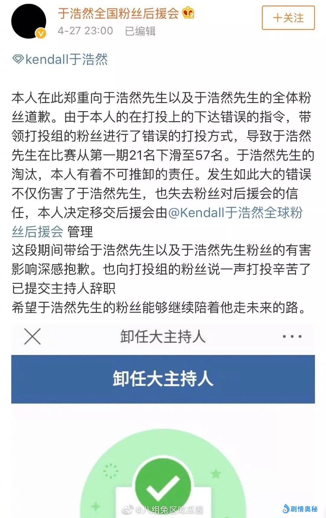 无独有偶,《创造营2019》的另外一位选手于浩然,在最新一期的节目中也惨遭淘汰。在节目播出后,于浩然粉丝后援会发布了一则道歉信,表示由于后援会下达了错误指令,带领“打投组”粉丝进行了错误的打投方式,导致于浩然在比赛中排名从第一期的21名下滑至57名,惨遭淘汰。对于这样的失误,后援会会长表示已提交主持人辞呈,将后援会交给他人管理。