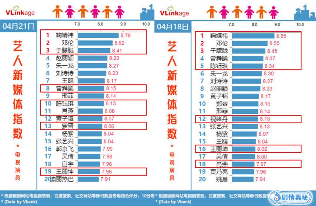 下图为4月18日和4月21日的艺人新媒体指数榜单,可以清晰看出,来自新版《新白娘子传奇》的于朦胧、鞠婧祎、肖燕;来自《封神演义》的邓伦、罗晋、王丽坤;以及来自新版《倚天屠龙记》的曾舜希、陈钰琪和祝绪丹,他们在剧集带动下,热度甚至飙升至流量明星的量级,承包了单日艺人新媒体榜单。
