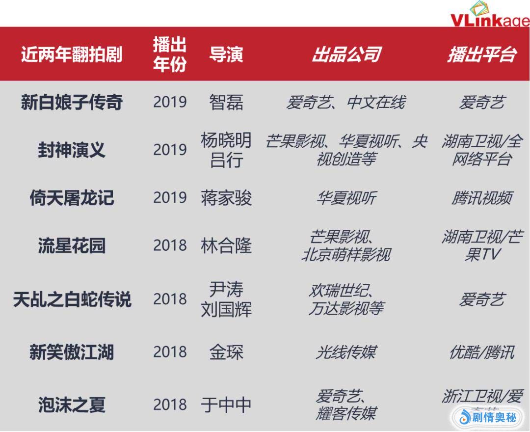 在IP口碑尽失变低调之后,翻拍剧撑起了“非原创”的舆论大旗。这股翻拍剧的浪潮以翻拍韩剧和日剧起步,蔓延至2018年,翻拍方向转至经典神话剧和武侠剧。下图为2018年至今翻拍剧的不完全统计: