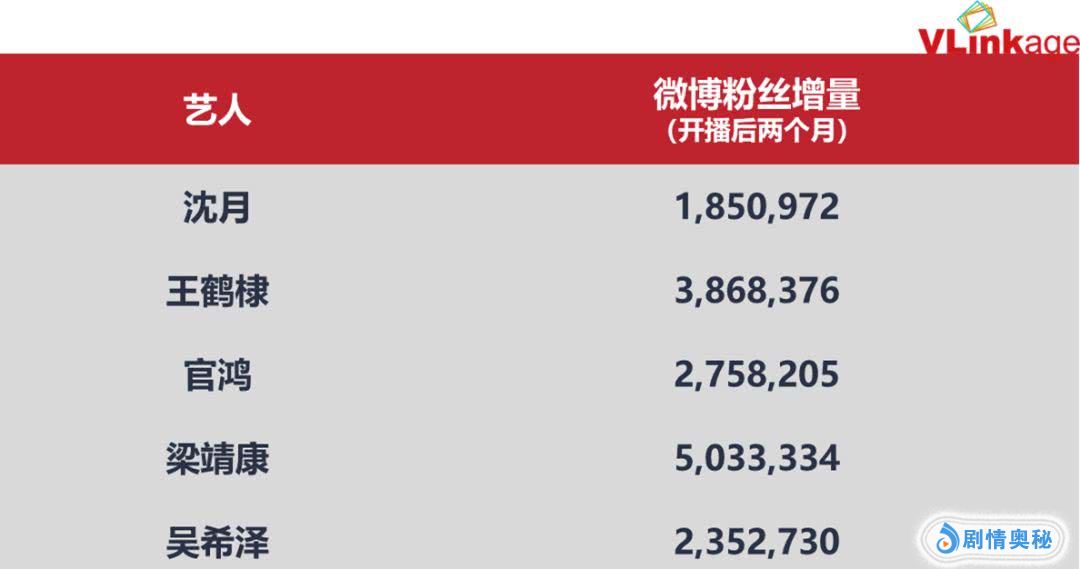 翻拍剧自带的关注度,远远高于网文IP,在流量效应之外,翻拍剧更是兼具“造星”功能,比如《流星花园》,“流星雨”版本就曾捧红了郑爽和张翰,此次又让沈月和新F4成员在新媒体端圈粉无数,下图为该剧开播期间几位主演的微博粉丝增量。