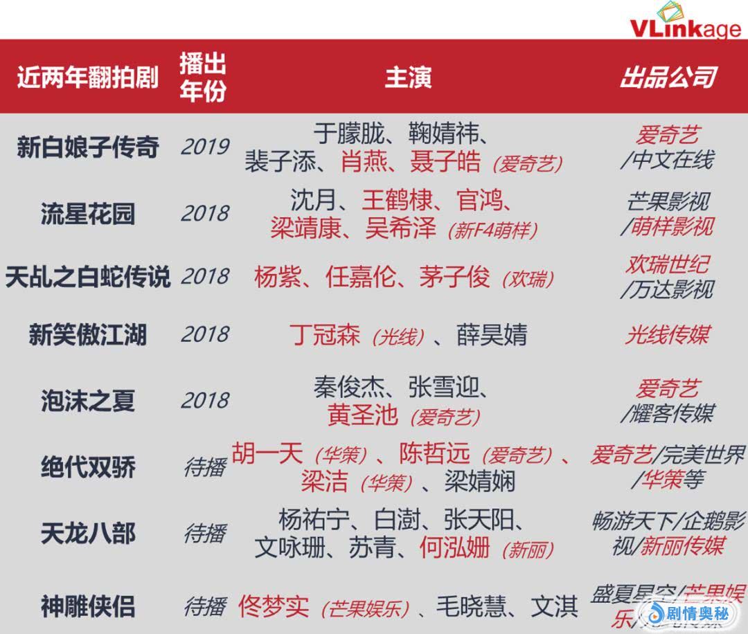而翻拍剧角色魅力加持下的“造星”功能,一方面能让出品方捧红旗下新人,另一方面又能降低演员成本,无疑有着较大的综合开发价值。于是,“新人+经典剧”的翻拍模式大行其道,下图为这些翻拍剧的主演阵容、以及这些主演与出品方的关联。