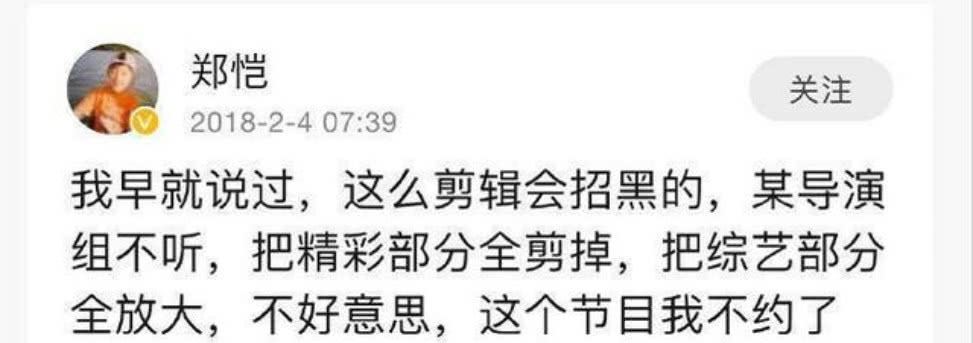 网友点名爆料郑恺在《奔跑吧》大庆站耍大牌,该爆料者是当期节目录制时的保安。他知道自己发布这条帖子的后果,力证自己说的是真话。把同期录节目的李晨、Angelababy、沙溢、朱亚文、宋雨琦、黄旭熙等人都夸了一遍,还祝某卫视收视长虹,单把郑恺“拎”出来批评。虽然正文里没点名,但按照他罗列的参与嘉宾顺序,一看就猜得出他指的是郑恺,而且他本人在评论区,也承认了网友对郑恺的猜测。于是关于“郑恺”的话题,一度跃居热点前十,现在下降到二十多的位置。
