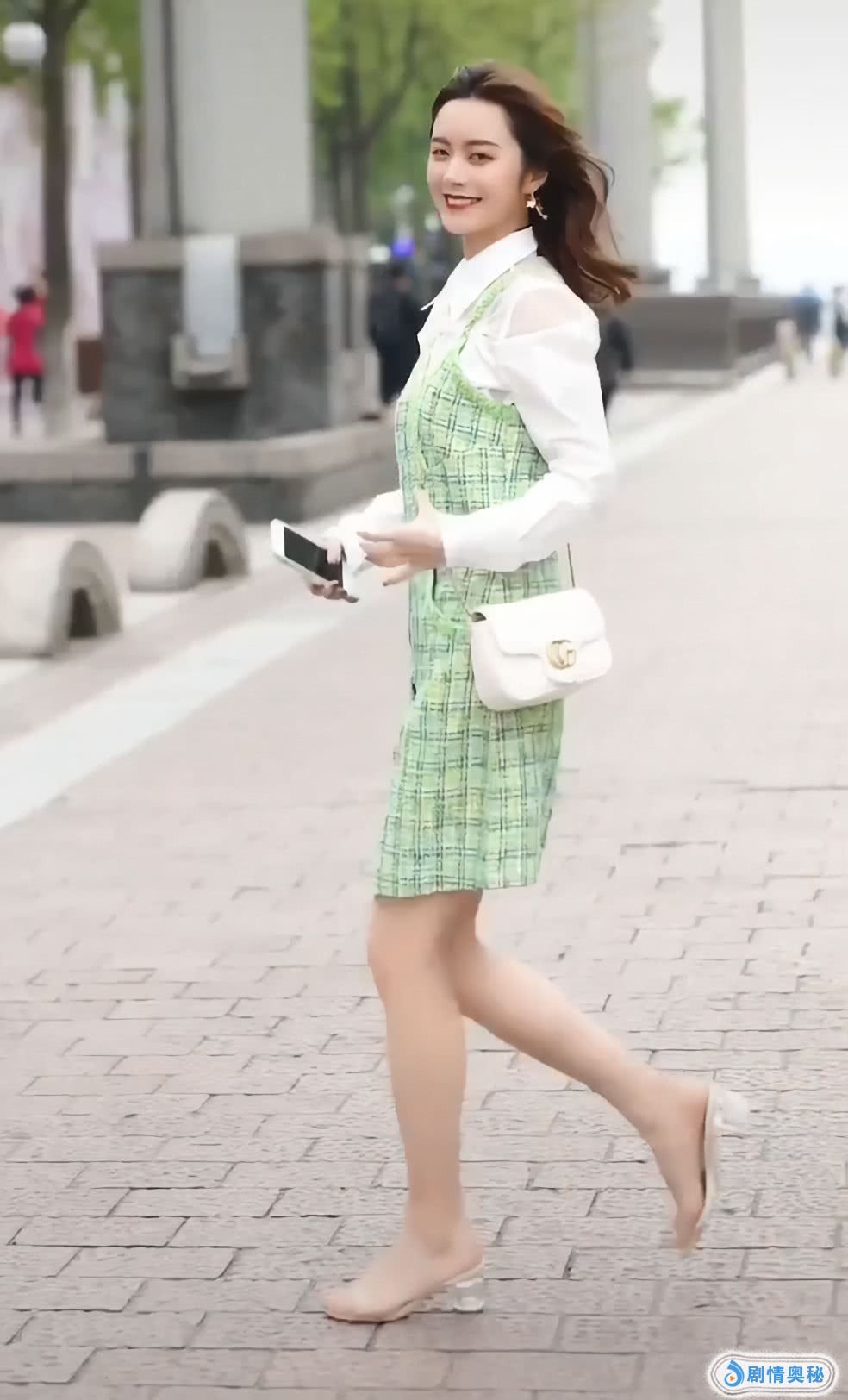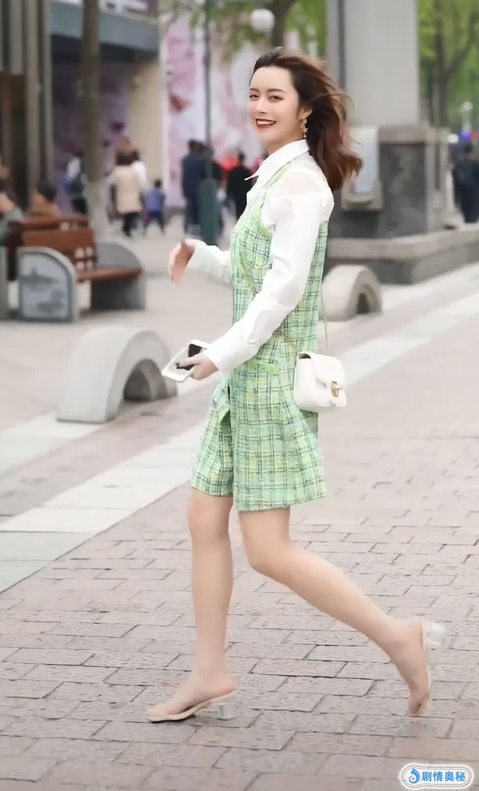 小姐姐的裙子是这种比较浅的颜色,看上去像树叶一样的颜色,她搭配了一个白色单肩包包,她的包包是有点可爱的,她的包包小巧玲珑,看上去就是很时髦的感觉,你喜欢这样的打扮吗?
