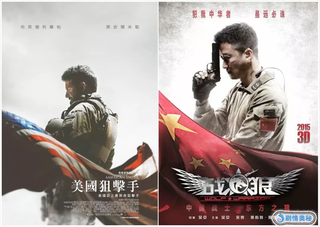 《美国狙击手》也是一部美式“主旋律”作品,这部由克林特·伊斯特伍德执导的伊拉克战争题材影片,其实也有一定的反战表达,但是它的海报设计将主人公和美国国旗融为一体,又传达了另外一种表意。事实上,《战狼》的一版海报就借鉴了《美国狙击手》。