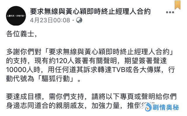 许志安黄心颖出轨事件已经历时半个月,从一开始地爆发式发酵到如今的趋于平淡,很多人都觉得这件事应该就此告一段落,事实上任何明星丑闻不都是经历这样的阶段?所以TVB在一开始的做法上也想着随着事情热度散去之后,能够息事宁人,更比较理想式地认为,时间能够让人忘记一切,故此只是将黄心颖雪藏,并没有做其他方面的“惩罚”,甚至都不提解约,还为她收拾残局。不过,想来黄心颖这次的丑闻事件又不是TVB所想的那么多简单,尽管目前媒体已经没有太刻意去继续对黄心颖狂追猛打,不过似乎网友不愿就此善罢甘休,在“追击”黄心颖的同时,还把矛头指向了TVB,甚至还发起了万人联署声明,将这次活动取名为“驱狐行动”,要求TVB对黄心颖事件进行重新处理。