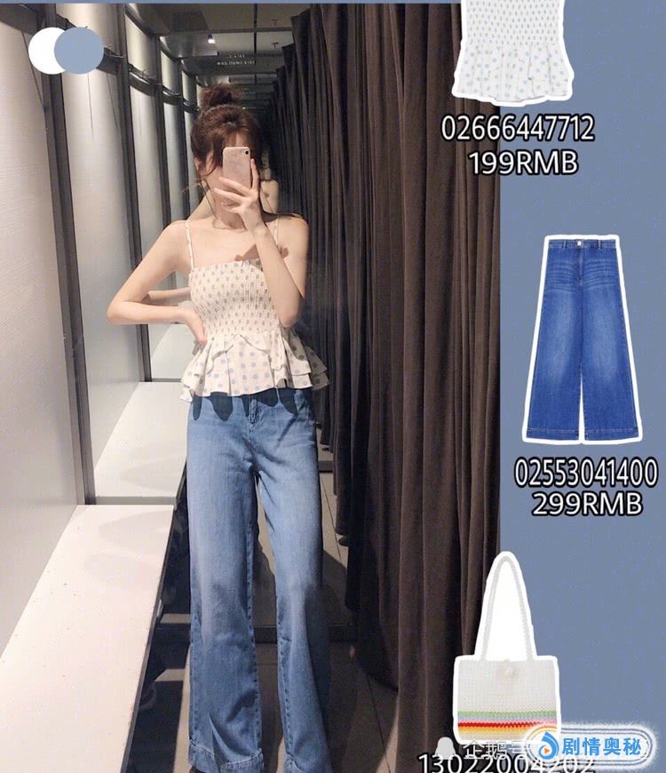 嫩蓝色小波点吊带,清新又有点甜,非常的适合夏天,这件高腰阔腿裤,显得腿又直又长,整体一身会显得人很高,非常的遮肉,很显瘦。